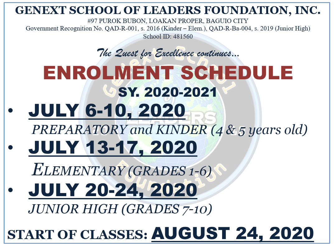 GENEXT SCHOOL OF LEADERS FOUNDATION, INC. (GSLFI) is a non-stock and not-for-profit Christian Foundation registered with the Securities & Exchange Commission. The school is also recognized with the Department of Education, under the K to 12 Program (DepEd Recognition- Kinder to Elementary: QAD-R-001, s.2016 and Junior High Recognition: QAD-R-Ba-004, s. 2019).